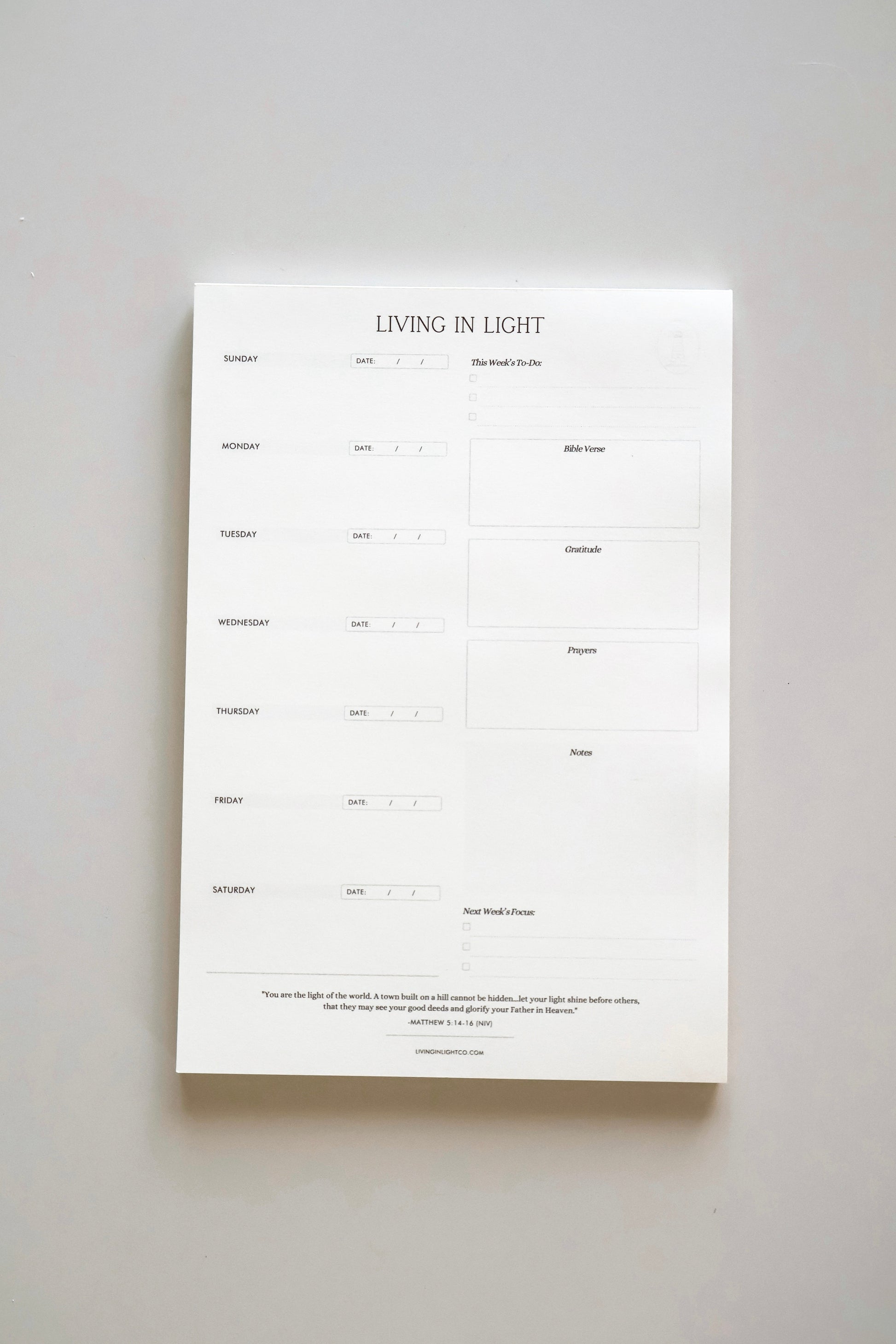 Build a simple weekly rhythm with the Living in Light Notepad Bundle. This set includes our Weekly Planning Notepad, Meal Planning Notepad, Grocery List Notepad, and the LILCO Blank Notepad. Use them together to plan meals, make lists, capture prayers, and map your week with clarity and peace. Designed to pair beautifully with our planners or to stand alone on your counter or desk.