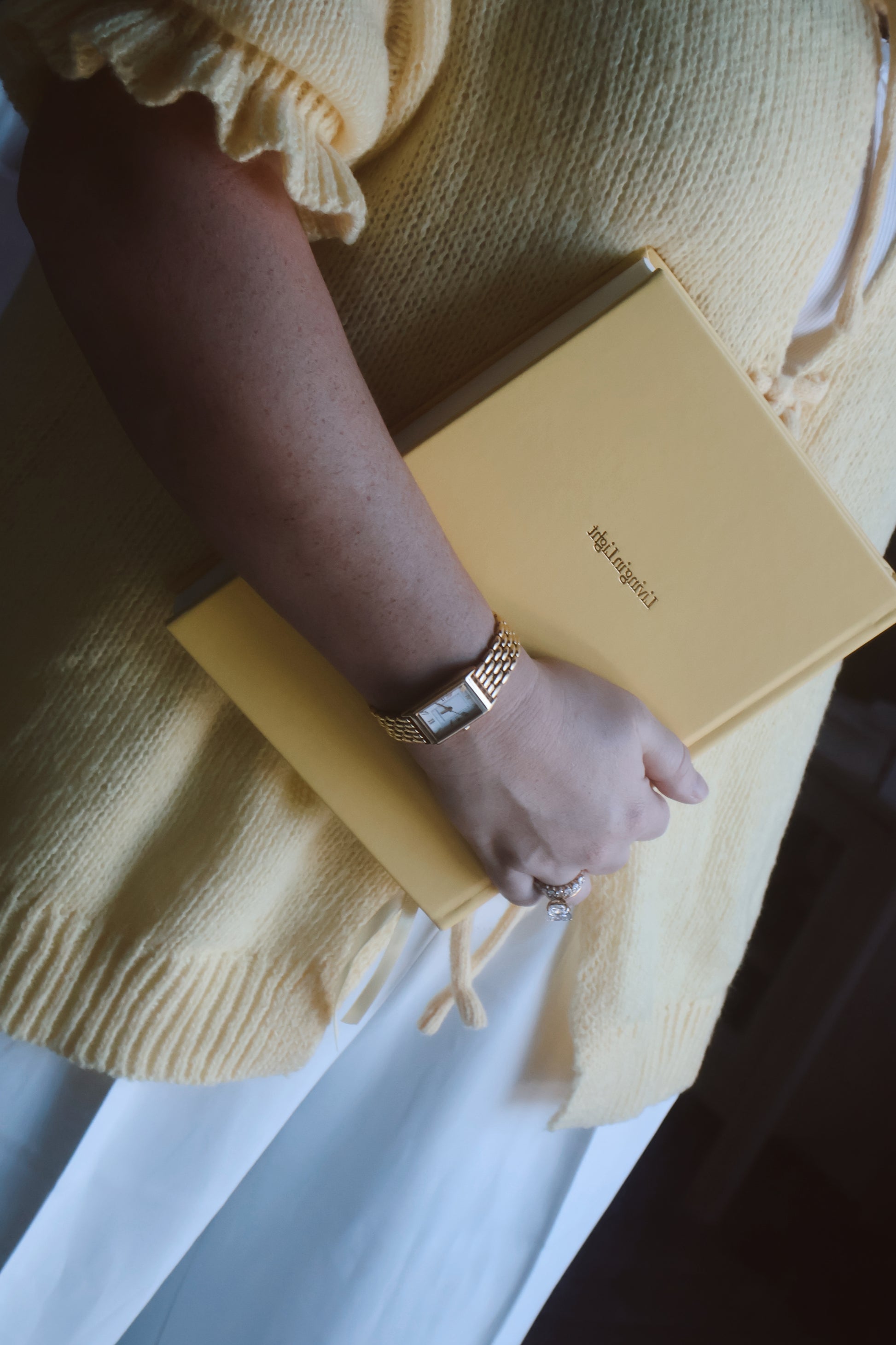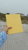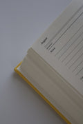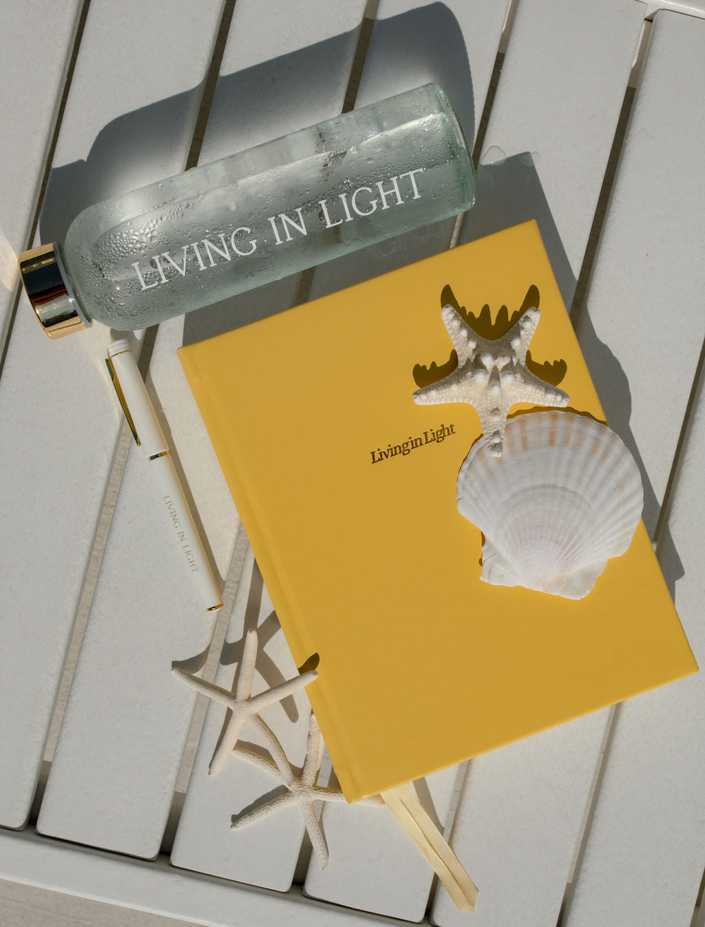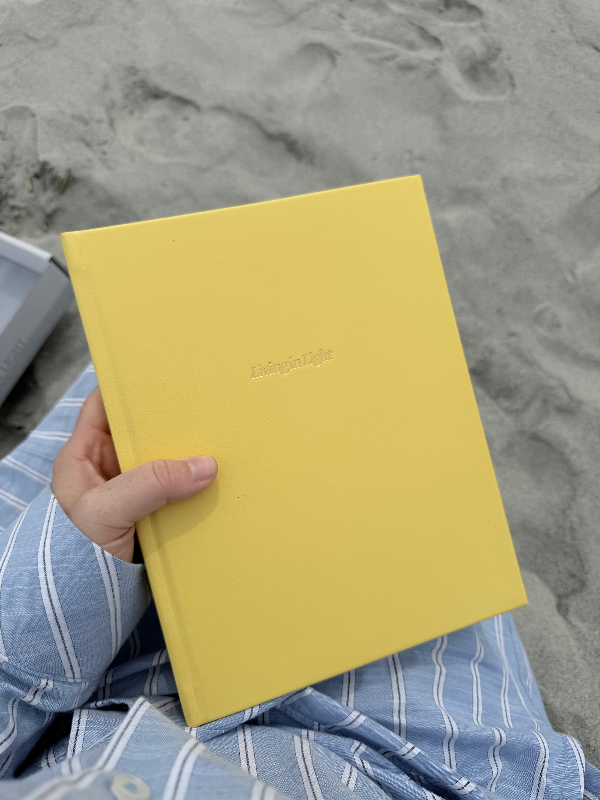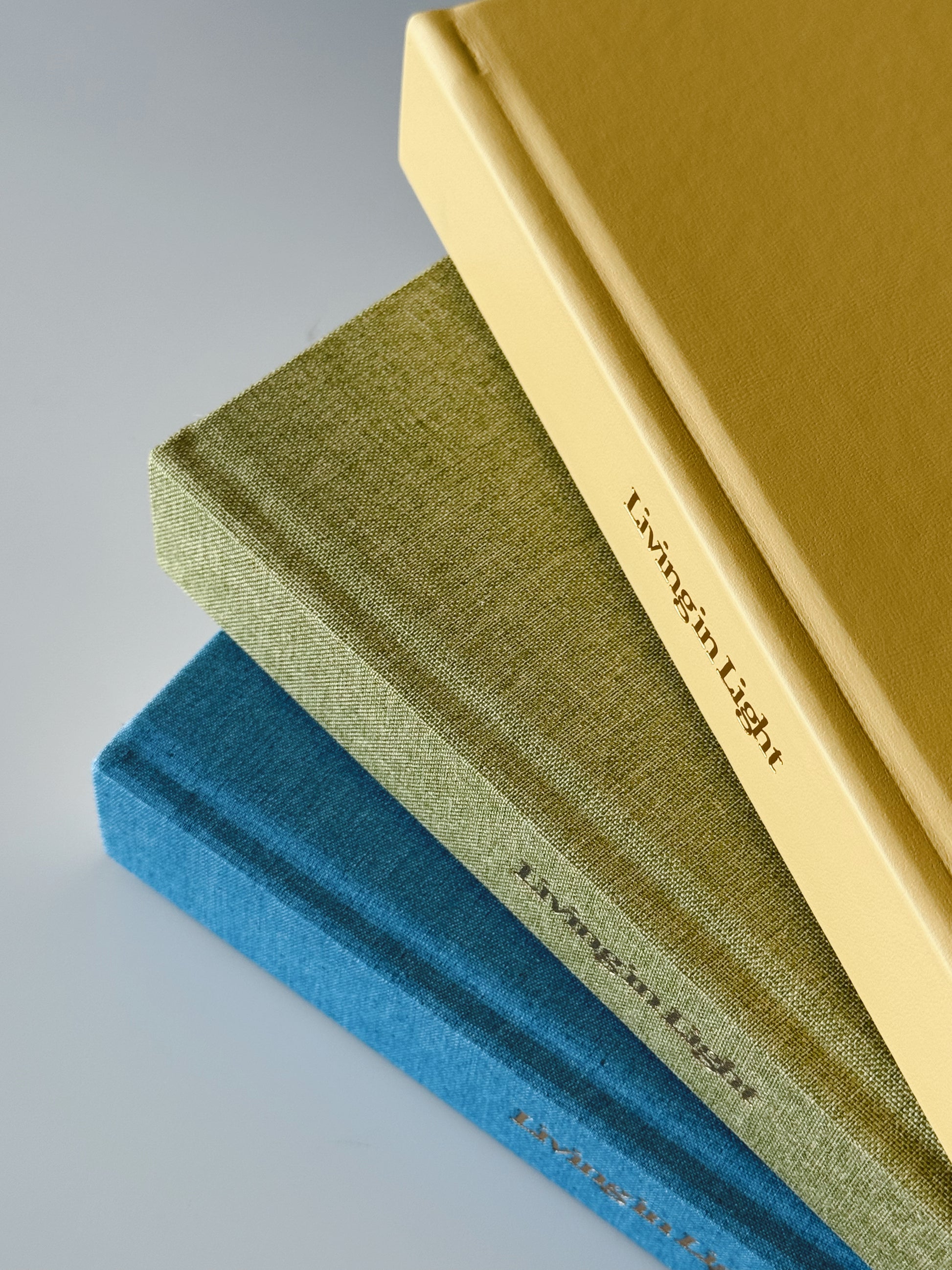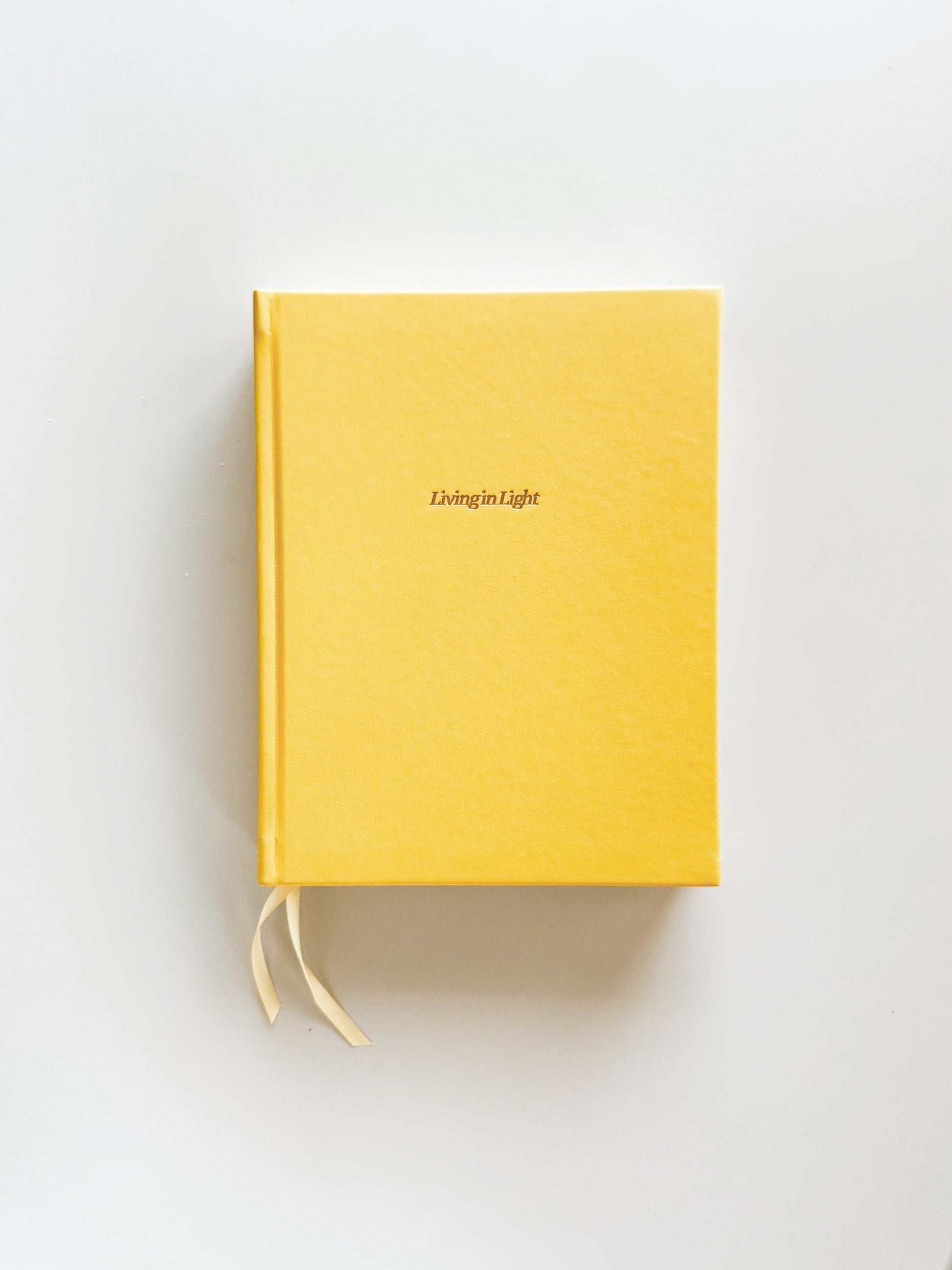 This yellow leather fabric was custom printed just for Living in Light. Each cover is embossed with honey gold foil on all sides and a butter yellow double satin ribbon divider on the inside.