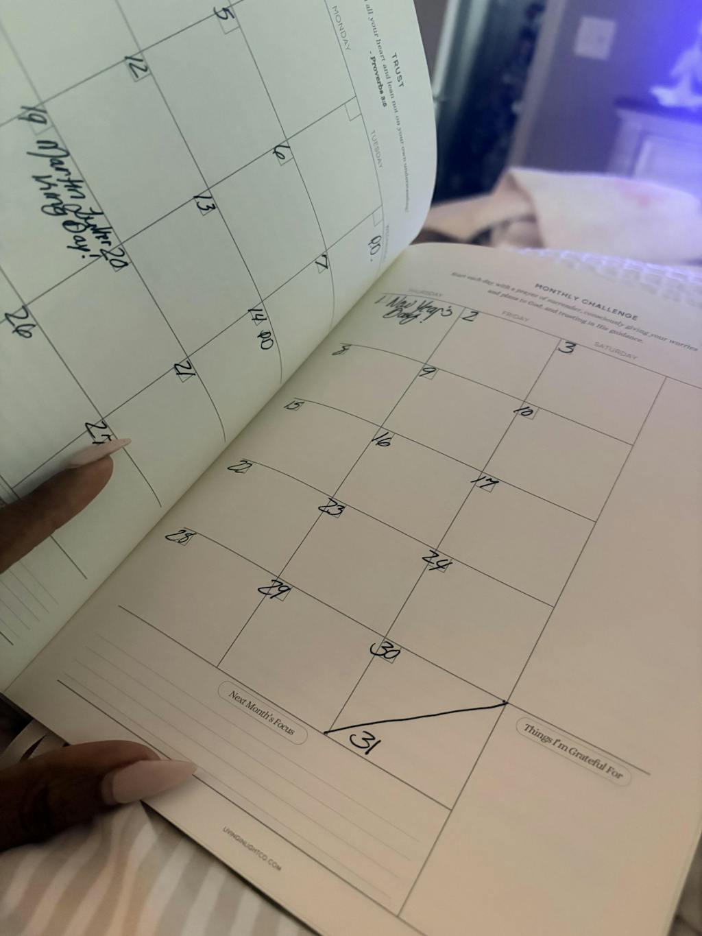 - Calendar (Undated): Two-page calendar spread layout. Includes space for monthly gratitude, priorities, and a Bible verse to memorize.