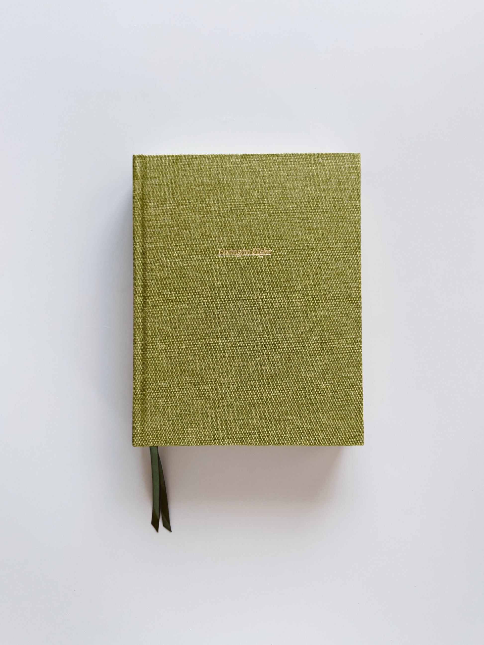 This vintage green linen fabric is embossed with light gold foil on all sides with a green double satin ribbon divider on the inside.