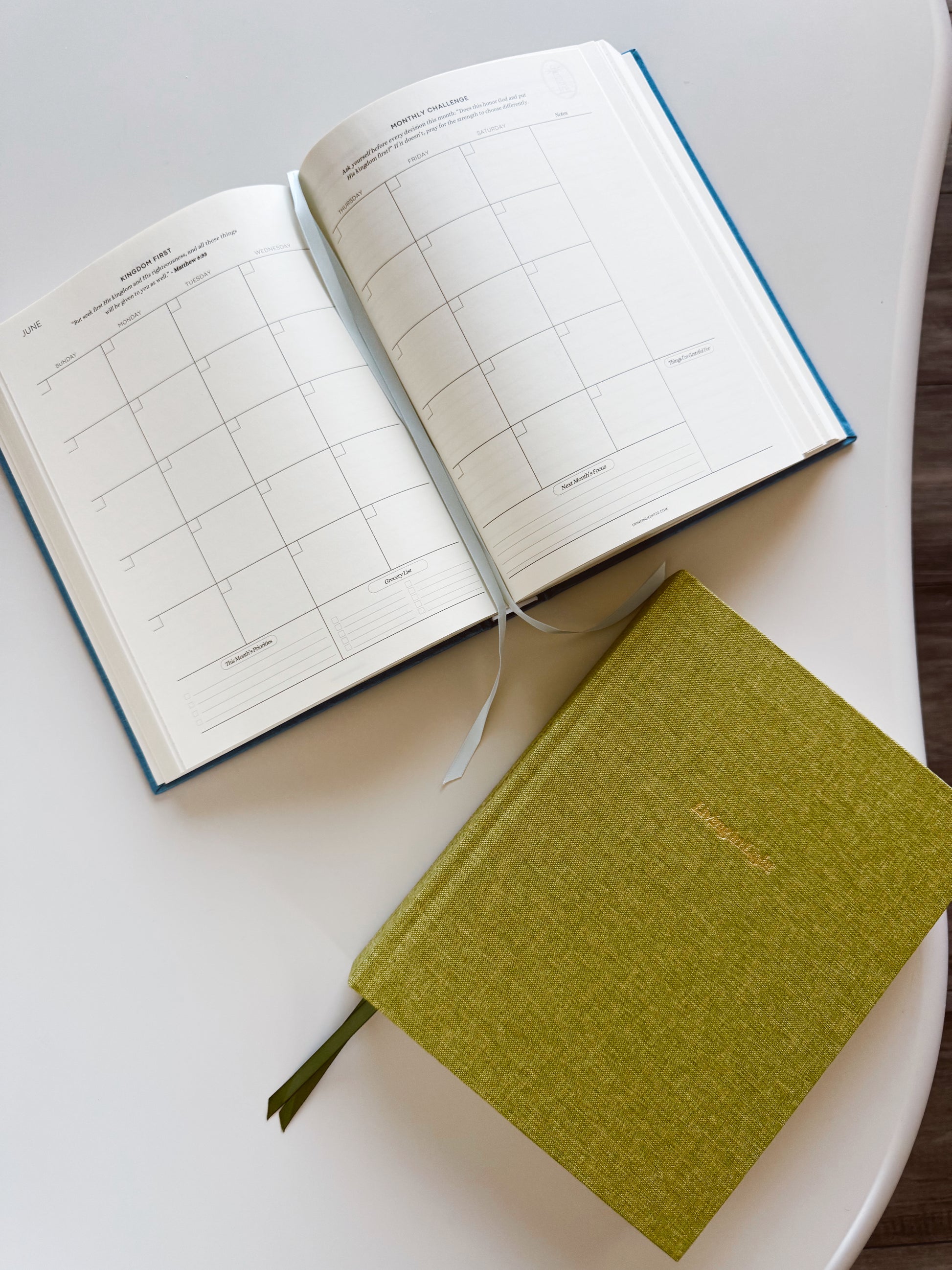- Calendar (Undated): Two-page calendar spread layout. Includes space for monthly gratitude, priorities, and a Bible verse to memorize.